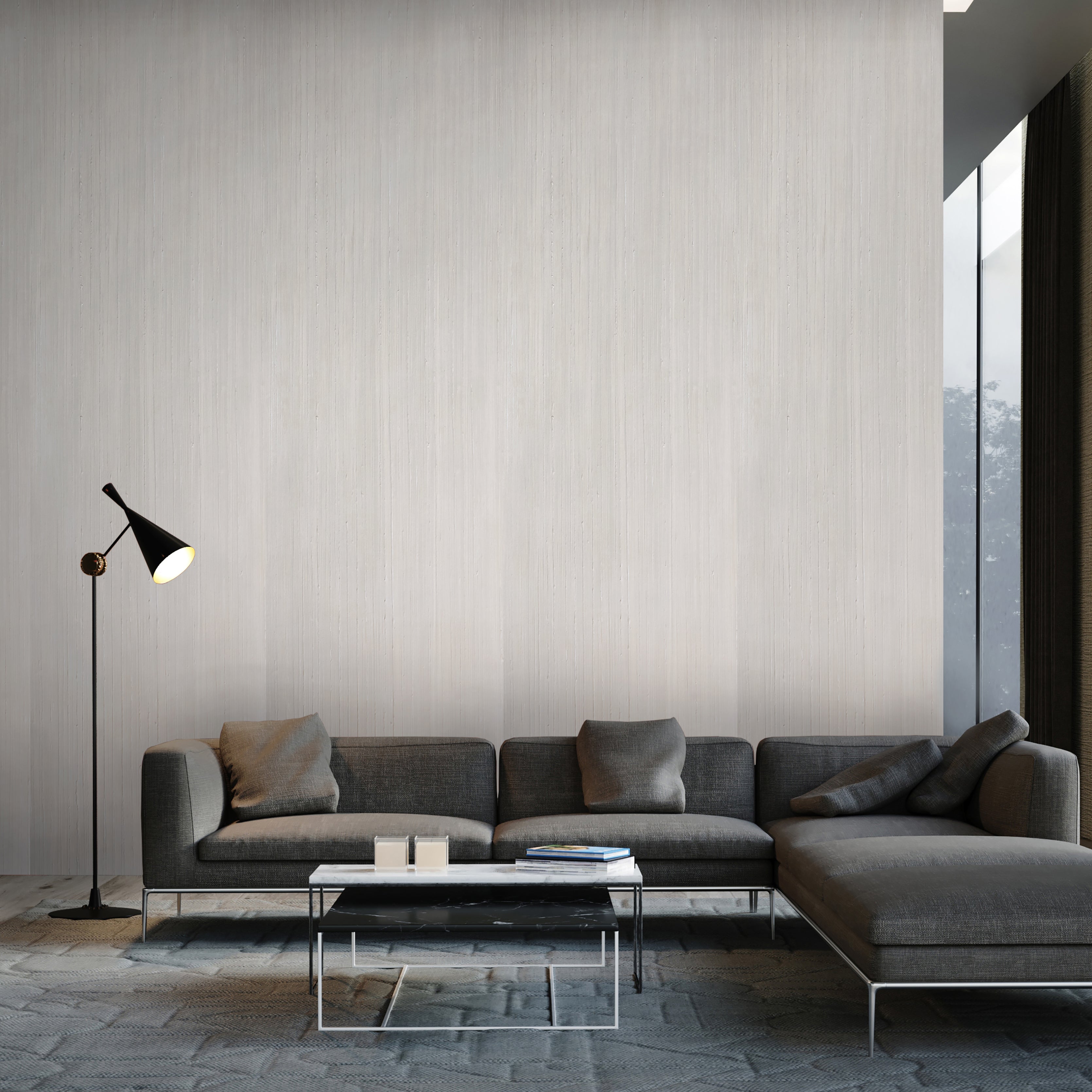 The Furrow Pattern features gradations of texture, color, and shade. The textured wallcovering features bold vertical lines that evoke the vines of a jungle, the trunks of a forest, or prismatic raindrops flowing down glass.