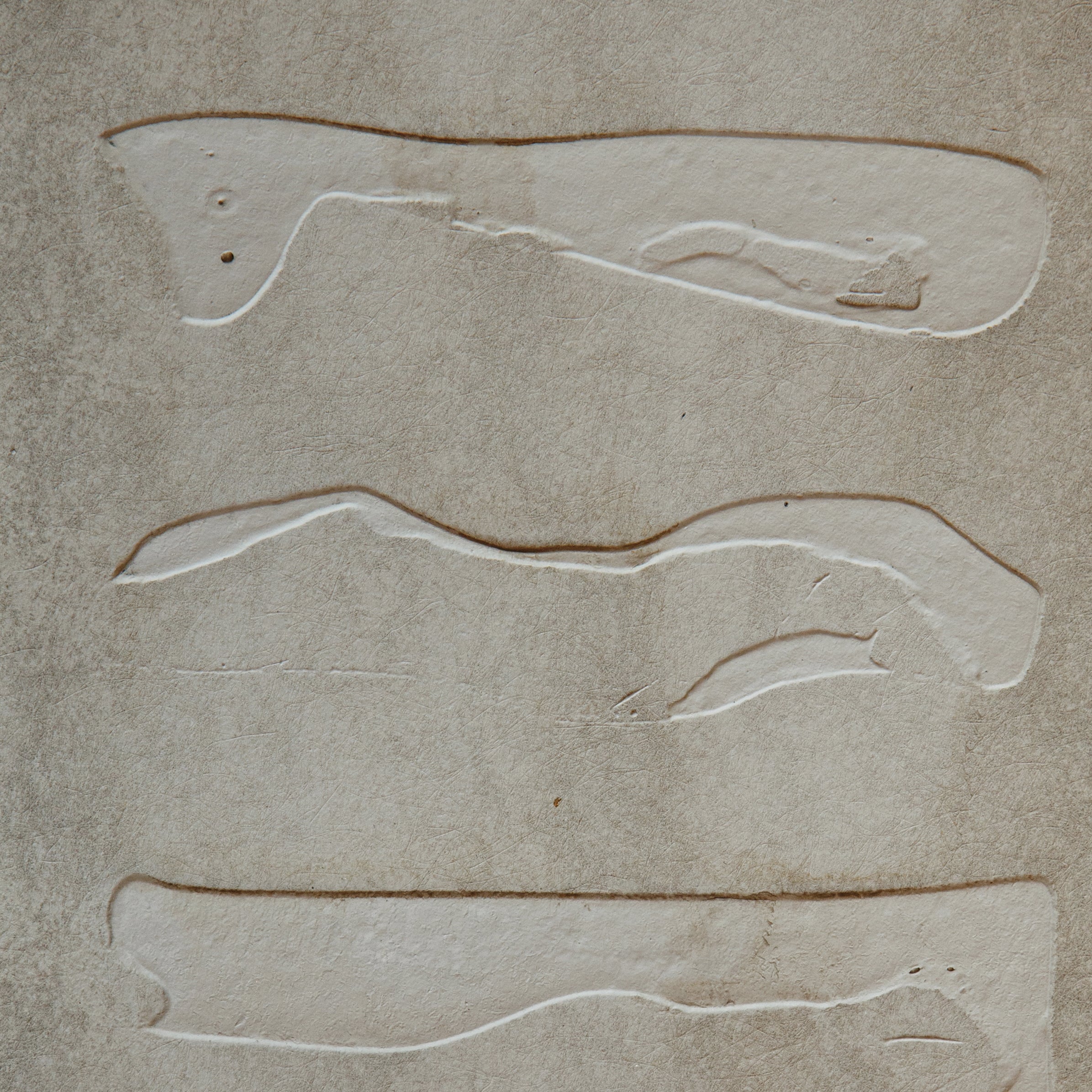 The handmade Gradiens Pattern features tidy columns of rough-textured shapes which create a fascinating bony ridge veiled in misted-on color. Darker color remnants pass and pool in the trenches of texture.