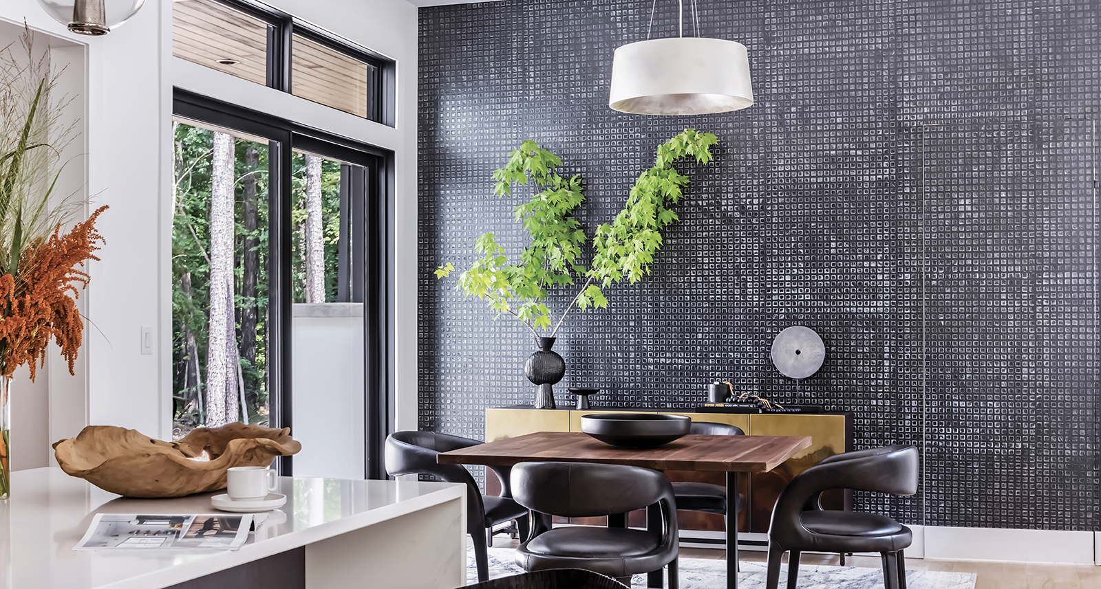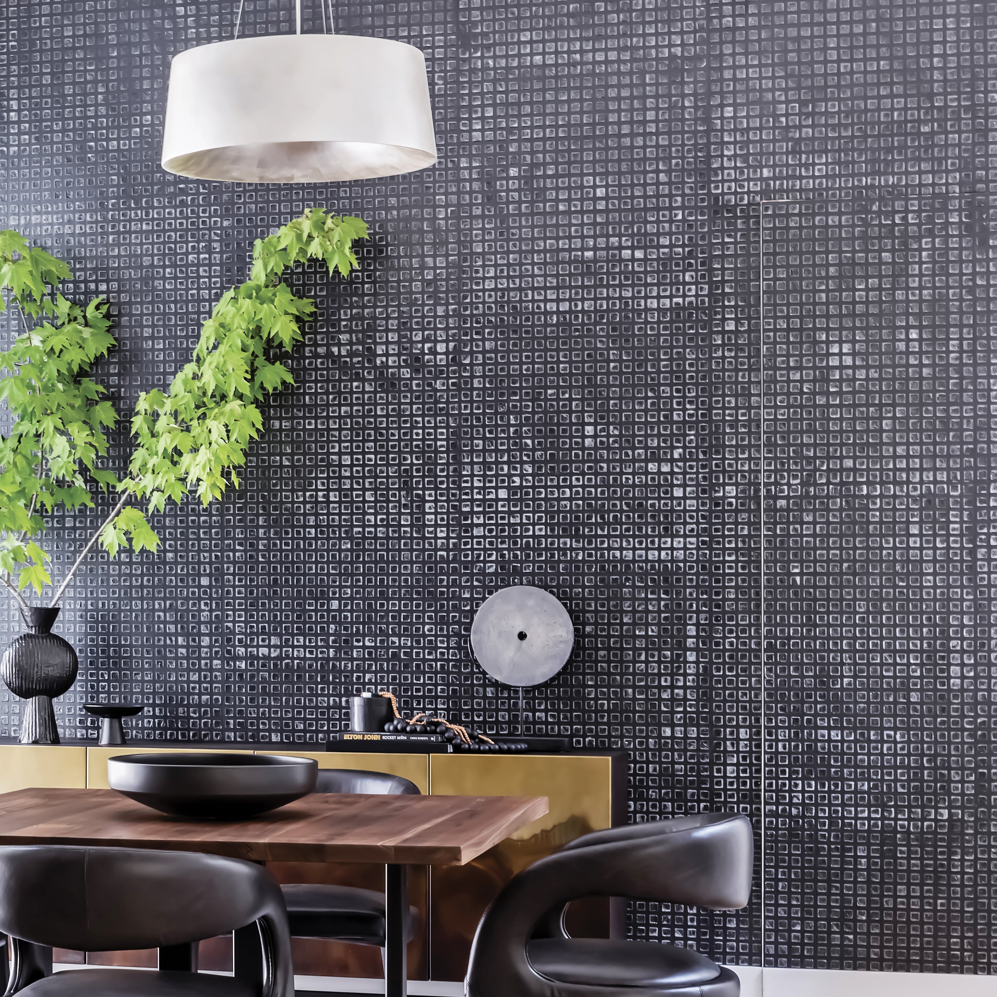 The Metro Pattern’s shimmering grid of beaded squares gives this textured wall covering a dynamic, industrial feel.